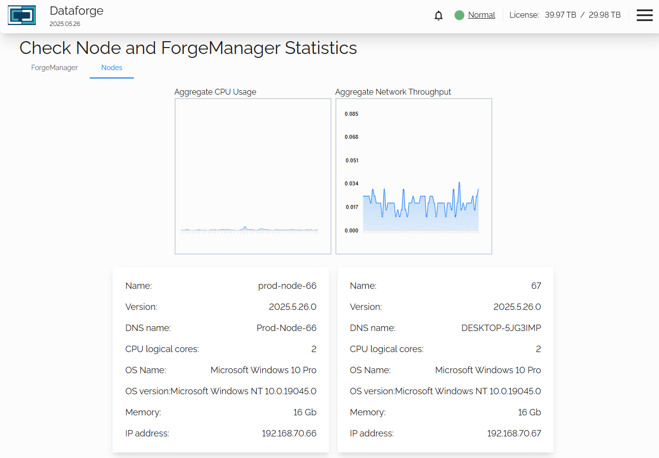 These tiles show you the current utilization of of both CPU and network usage across all nodes. This information is not specific to DataForge, but gathered from the Windows environment. With no jobs running, you will still see utilization for both as the Windows system itself may be using resources.