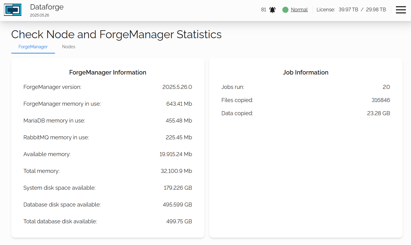 This information tile will show the resources for the DataForge Application server and the cumulative job statistics.